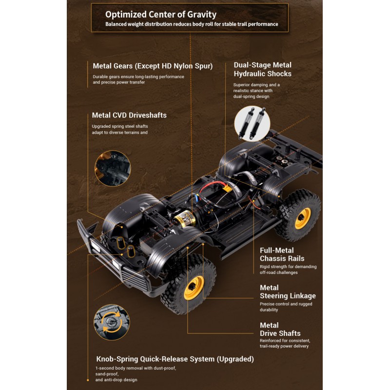 Chaque modèle regorge de détails fidèles à l’échelle, notamment des rétroviseurs latéraux, des snorkels, des projecteurs fonctionnels et un intérieur entièrement détaillé. La carrosserie en plastique souple PC durable est équipée de phares, de feux de recul et de garde-boue préinstallés, garantissant à la fois réalisme et protection robuste.